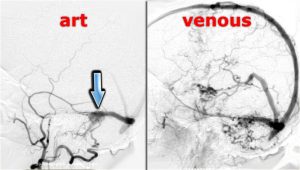 Hình ảnh DSA của một bệnh nhân bị rò động tĩnh mạch màng cứng (DAVF). Ghi nhân có sự thông nối trực tiếp giữa các nhánh của động mạch cảnh ngoài và xoang ngang (mũi tên màu xanh). Tiếp tục với hình ảnh T2W bên dưới.