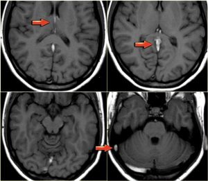 Hình. Thrombosis of internal cerebral veins: Huyết khối trong tĩnh mạch não trong gây ra các vùng nhồi máu đối xứng tương ứng tại vị trí mũi tên.