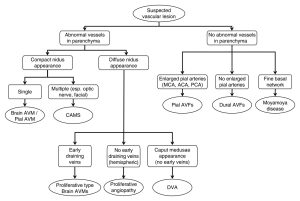 Hình 1: Sơ đồ minh họa cách tiếp cận chẩn đoán dựa trên hình ảnh học thực hành đối với các tổn thương nghi ngờ do mạch máu não. ACA = anterior cerebral artery: động mạch não trước, CAMS = cerebrofacial arteriovenous metameric syndrome: hội chứng dị dạng động tĩnh mạch vùng mặt và não theo phân đoạn phôi thai, MCA = middle cerebral artery: động mạch não giữa, PCA = posterior cerebral artery: động mạch não sau.
